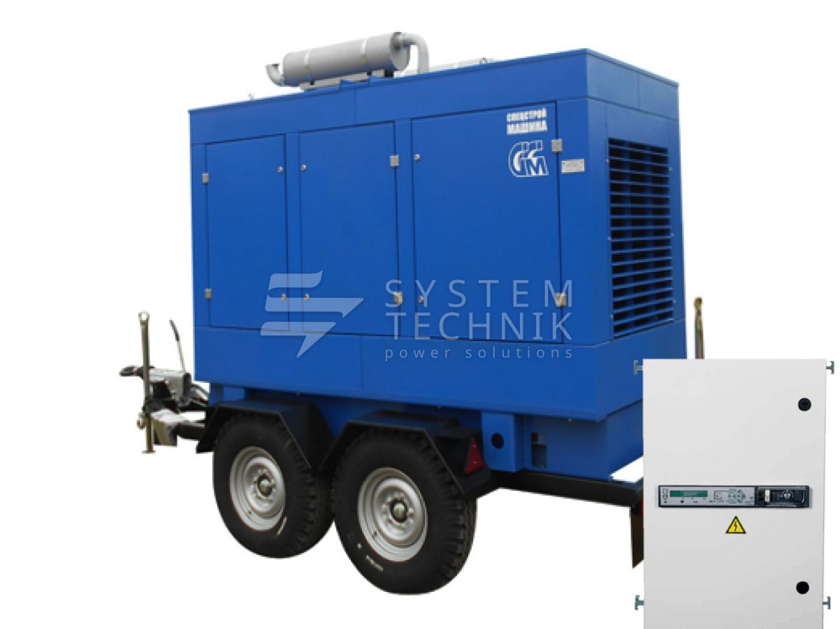- ССМ ЭД-200-Т400-2РКМ2 (Marelli) в шумозащитном кожухе на шасси с АВР на прицепе